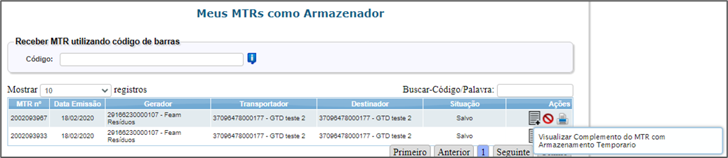 Será apresentada a lista de MTRs que tem aquele CNPJ ou CPF como parte, respectivas data de emissão e situação do manifesto, ou seja, se o MTR foi apenas emitido (situação “Salvo”), se foi Recebido (situação “MTR Recebido”), se foi cancelado ou se está em armazenamento temporário.