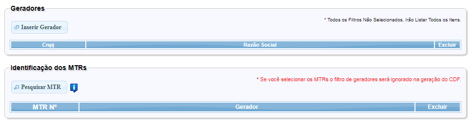 Esse relatório permite ao servidor consultar os MTRs que possuem determinado CNPJ/CPF como gerador, transportador e/ou destinador para determinado período.