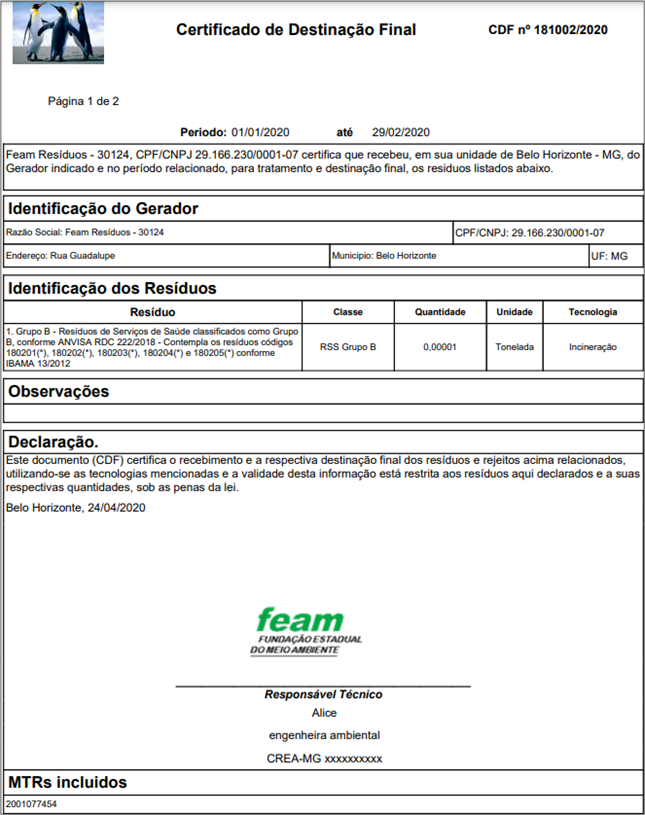 No sistema também é emitido o Certificado de Destinação Final (CDF) pelos empreendimentos de destinação de resíduos, atestando a destinação, final ou intermediária, dos resíduos e rejeitos recebidos. Dessa forma, a plataforma constitui importante instrumento de gestão e fiscalização, permitindo o monitoramento, pelos órgãos ambientais e de limpeza urbana, da geração, armazenamento temporário, transporte e destinação final dos resíduos para os quais o MTR é obrigatório, no território mineiro.