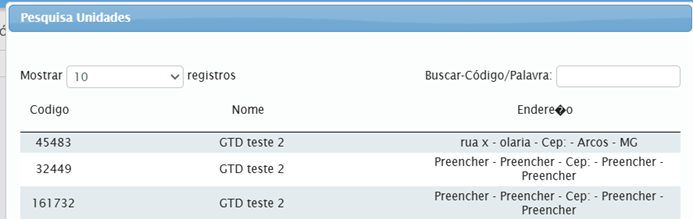 Caso o estabelecimento esteja cadastrado, o sistema mostrará a(s) unidade(s) cadastradas com a razão social ou CNPJ/CPF indicado no campo de busca. No exemplo a seguir foi inserida a razão social do empreendimento, e como se trata de uma razão social com várias unidades, o Sistema apresenta a lista das unidades: