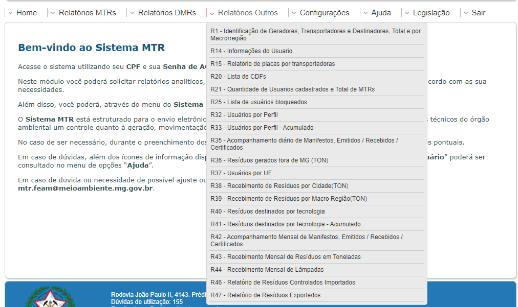 - Entrar em contato com o Lig Minas, pelo telefone 155 (opção 7), ou com a equipe de apoio ao Sistema MTR na SEMAD, pelo telefone (31)3915-1141.