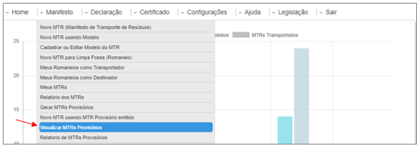 A qualquer momento você poderá visualizar os MTRProvisórios gerados pelo sistema, podendo reimprimi-los, caso necessite, utilizando a opção “Visualizar MTRs Provisórios” no menu “Manifesto”.